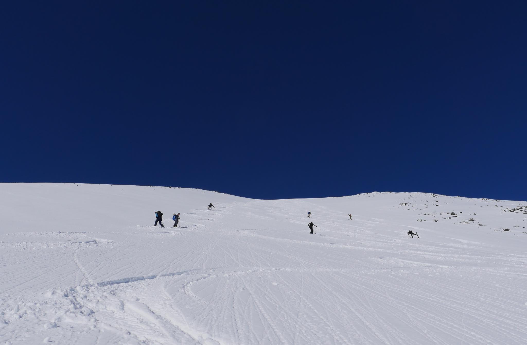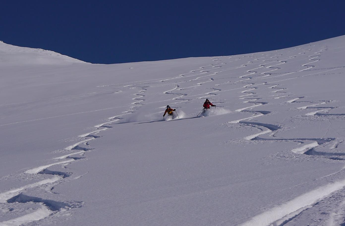 Dort eröffnet sich eine Vielzahl an lohnenden Abfahrtsvarianten, die je nach Bedingungen und Gruppe gewählt werden können.