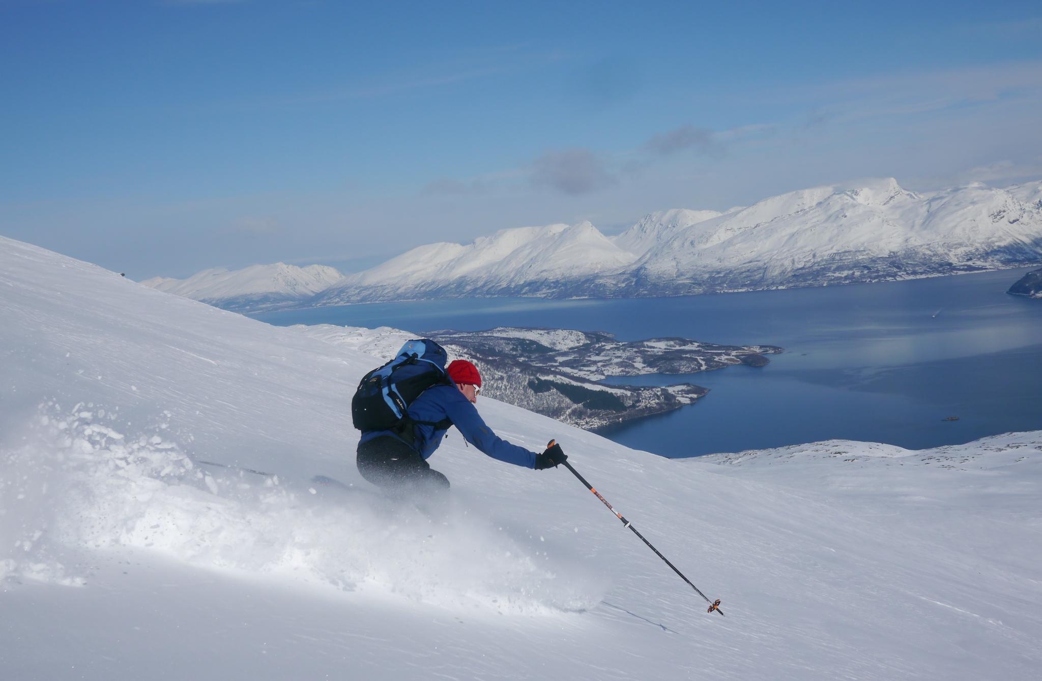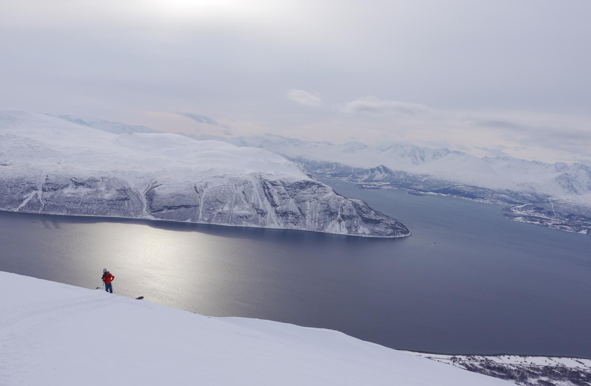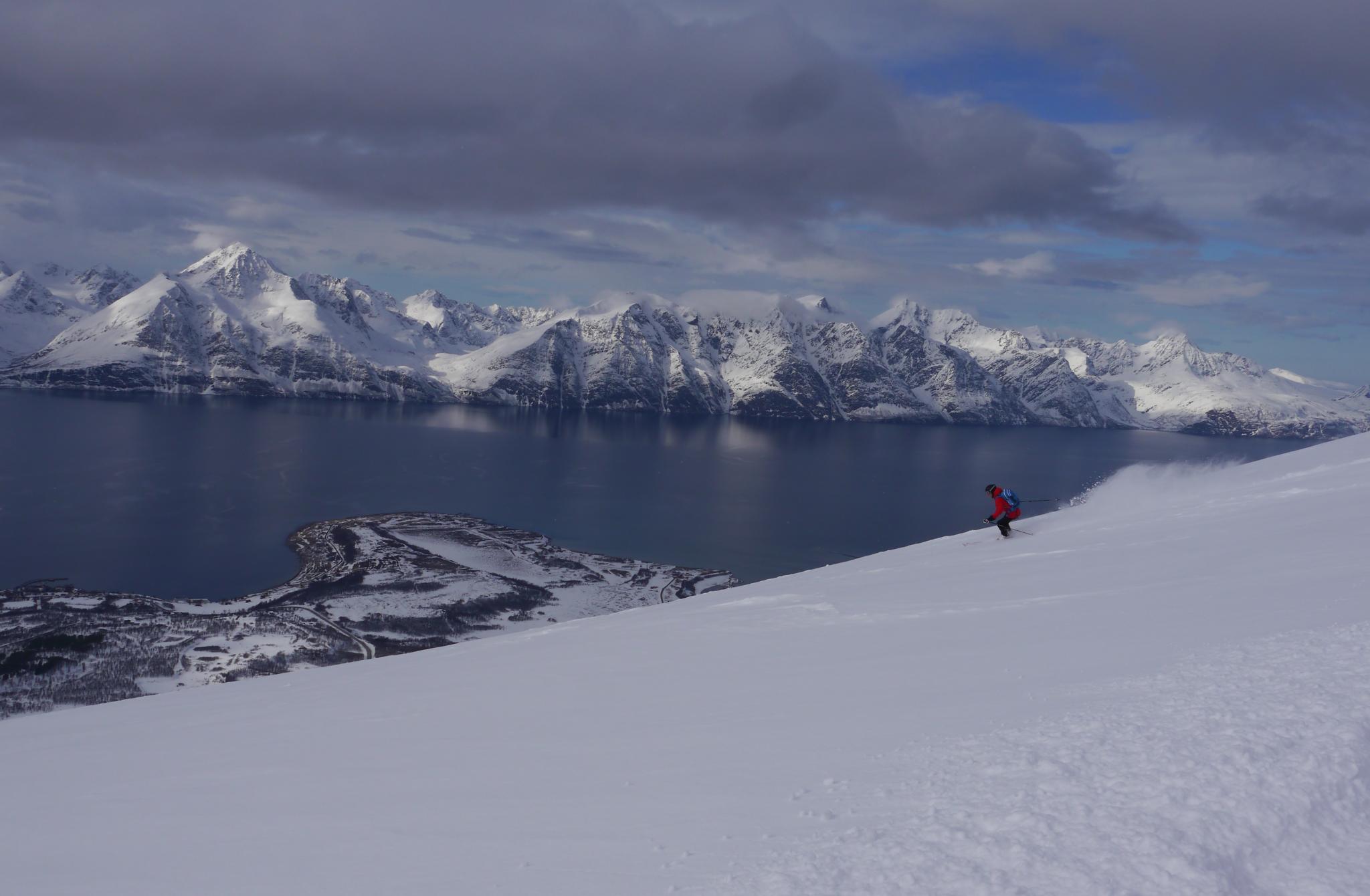 Der Storgalten befindet sich im hohen Norden der Halbinsel und ist von Lyngseidet aus in rund fünfzig Minuten gut zu erreichen. Diese Tour vereint zwei charakteristische Elemente der Region: den offenen, weiten Blick über das Polarmeer und einen Gipfelhang, der in seiner Form und Neigung nahezu ideal zum Skifahren ist.