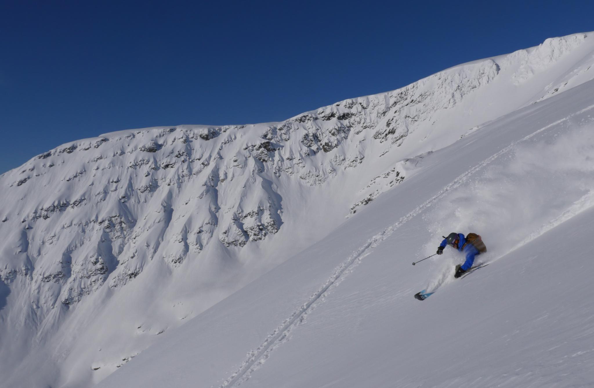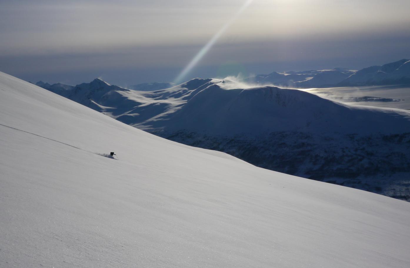 Eine schöne Alternative ist die Abfahrt nach Kvalvik – oder auch der Anstieg von dort. Von dieser Seite bietet sich auch der südlich gelegene Goalsevárri als attraktives Ziel an. Ganz gleich, wie man die Tour gestaltet: Die Abfahrt wird in jedem Fall zu einem besonderen Erlebnis.