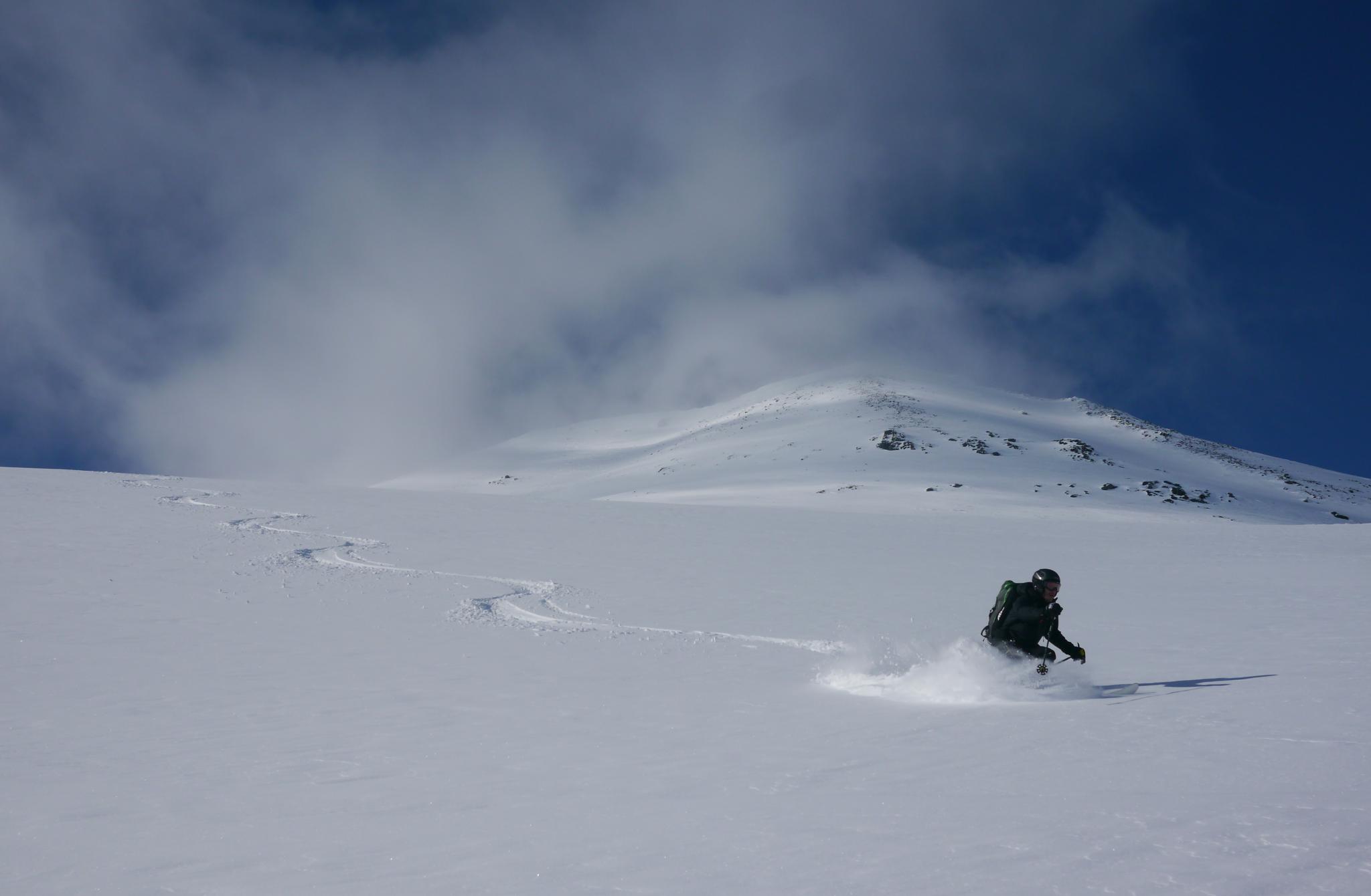 Die Abfahrt führt in einem langen, zusammenhängenden Hang über etwa 800 Höhenmeter hinab. Insgesamt legen wir 1.219 Höhenmeter zurück – eine eindrucksvolle Linie, die direkt am Meer beginnt und auf einem markanten Gipfel endet.