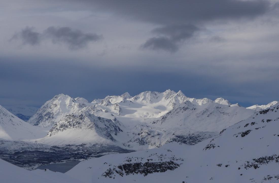 Vom Gipfel aus richtet sich der Blick zurück über den Fjord nach Lyngseidet und hinüber zu den eindrucksvollen Gletscherflanken rund um den Tafeltinden – ein Panorama, das die besondere Weite dieser Region spürbar macht.